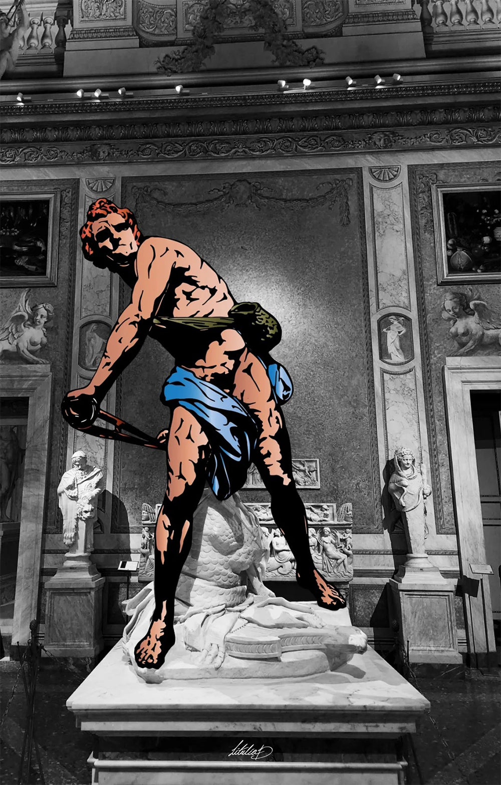 Her practice explores the intersection of hand-drawn linework and digital manipulation. Influenced by comic books, Pop Art, typography, and the power of scale, she gravitates toward bold, dynamic compositions and the simplicity of limited palettes. Her subjects, ranging from iconic statues and art historical imagery to vintage comics and everyday objects, are reimagined into striking works that challenge perception.